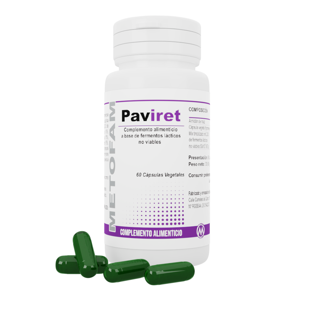 Presentamos Paviret, el complemento alimenticio diseñado para fortalecer tu sistema inmunológico y promover el bienestar respiratorio. Formulado con una exclusiva mezcla de fermentos lácticos no viables, Paviret ayuda a mantener una microbiota intestinal equilibrada, esencial para unas defensas robustas. Apto para adultos y niños a partir de 5 años, este suplemento es fácil de incorporar en tu rutina diaria.
